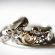 18金イエローゴールド、ホワイトゴールドの結婚指輪です。 プラチナで作る場合が多いですが最近はゴールド系も増えてきました。 金も仕上げ方法で雰囲気が変わります。 部分的に地を荒らして光を抑えた仕上げです。 今回はどちらかというとアクセントで部分的に使い指輪の立体感や質感を出しました。